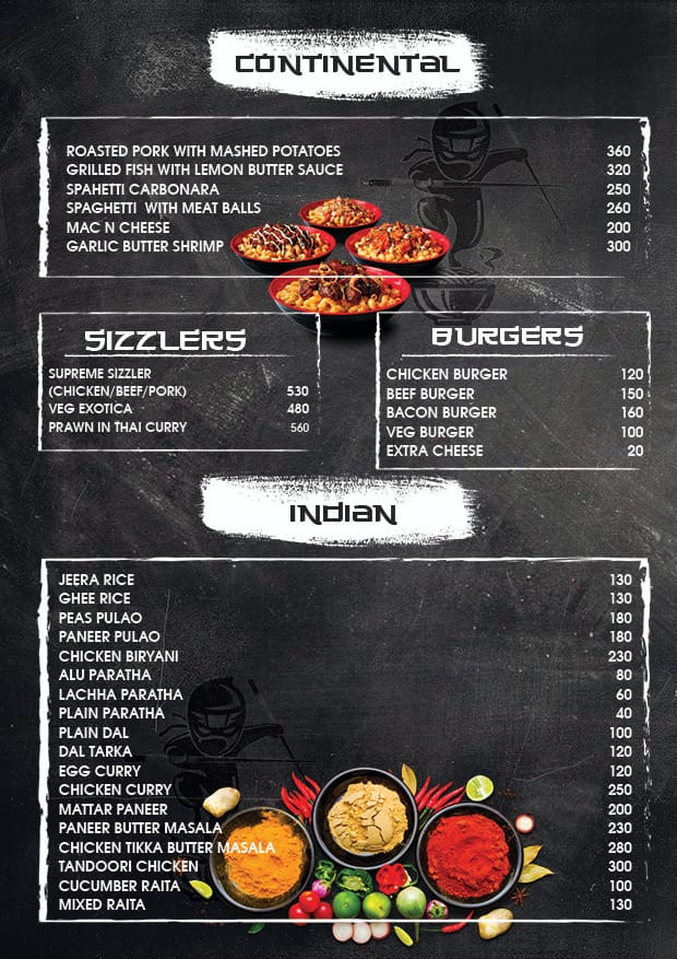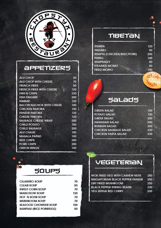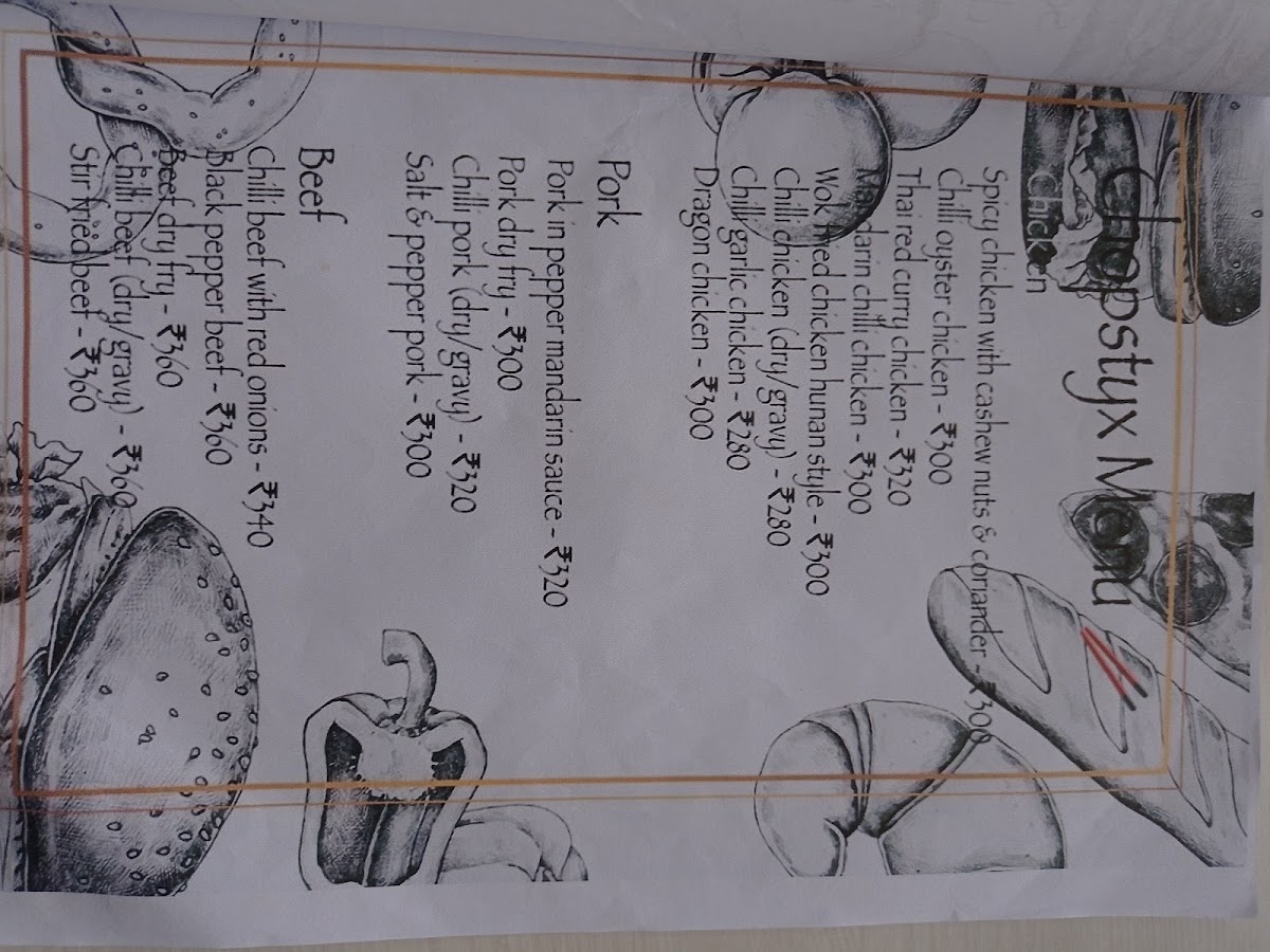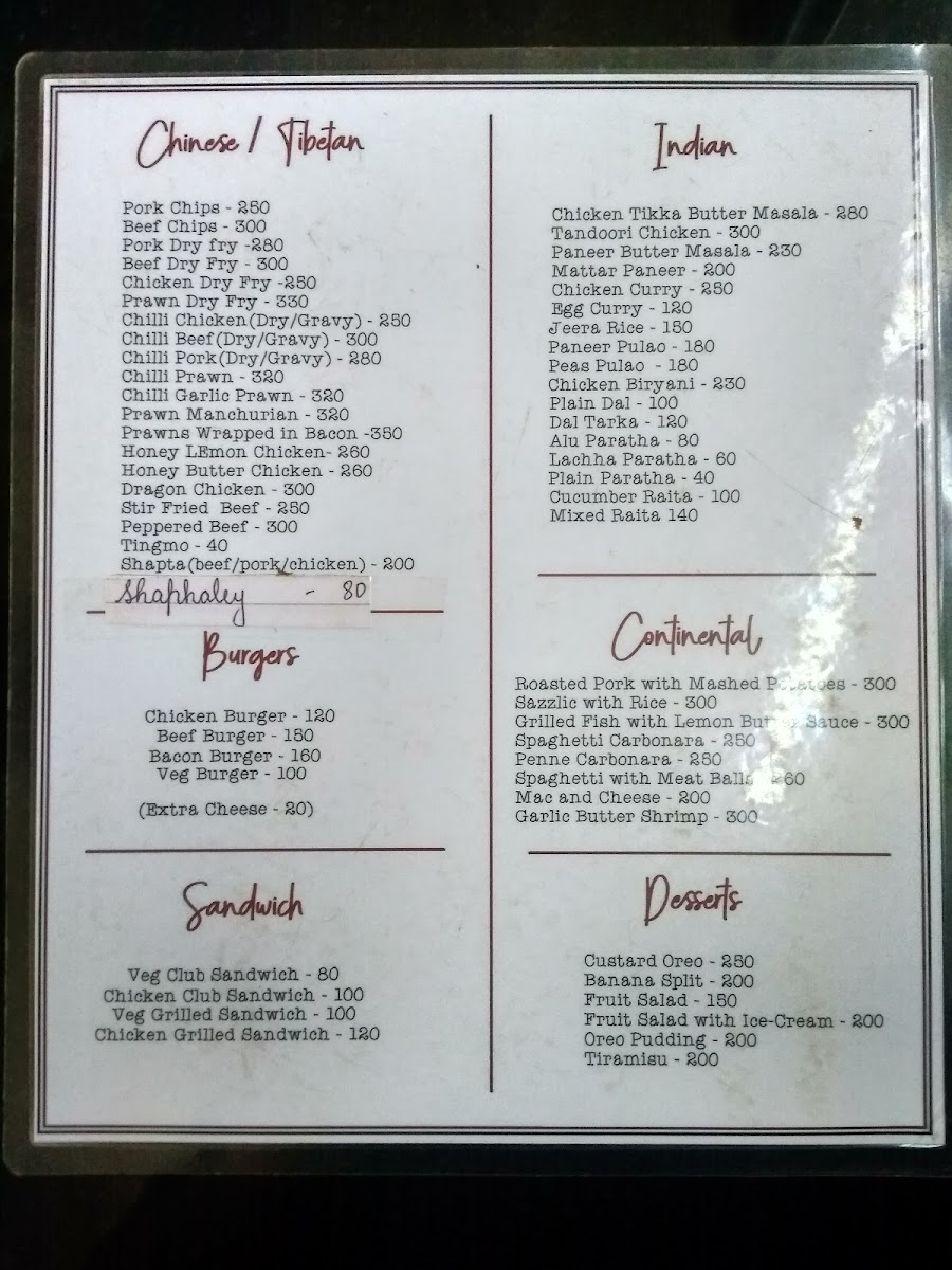 The main menu additionally includes a variety of Chinese and seafood specialties. Signature offerings include noodle and rice dishes such as Thukpa, Thai Noodle, Fried Rice Chicken, Pork Chips, Pork Ribs, Chinese Noodles, Rice Momo, Fried Rice Noodles, Chilli Dry Pork, Gravy Chicken Noodle, and Chilli Butter Chicken. There are also items like Steamed Momo and Beef Burger to accommodate different tastes.