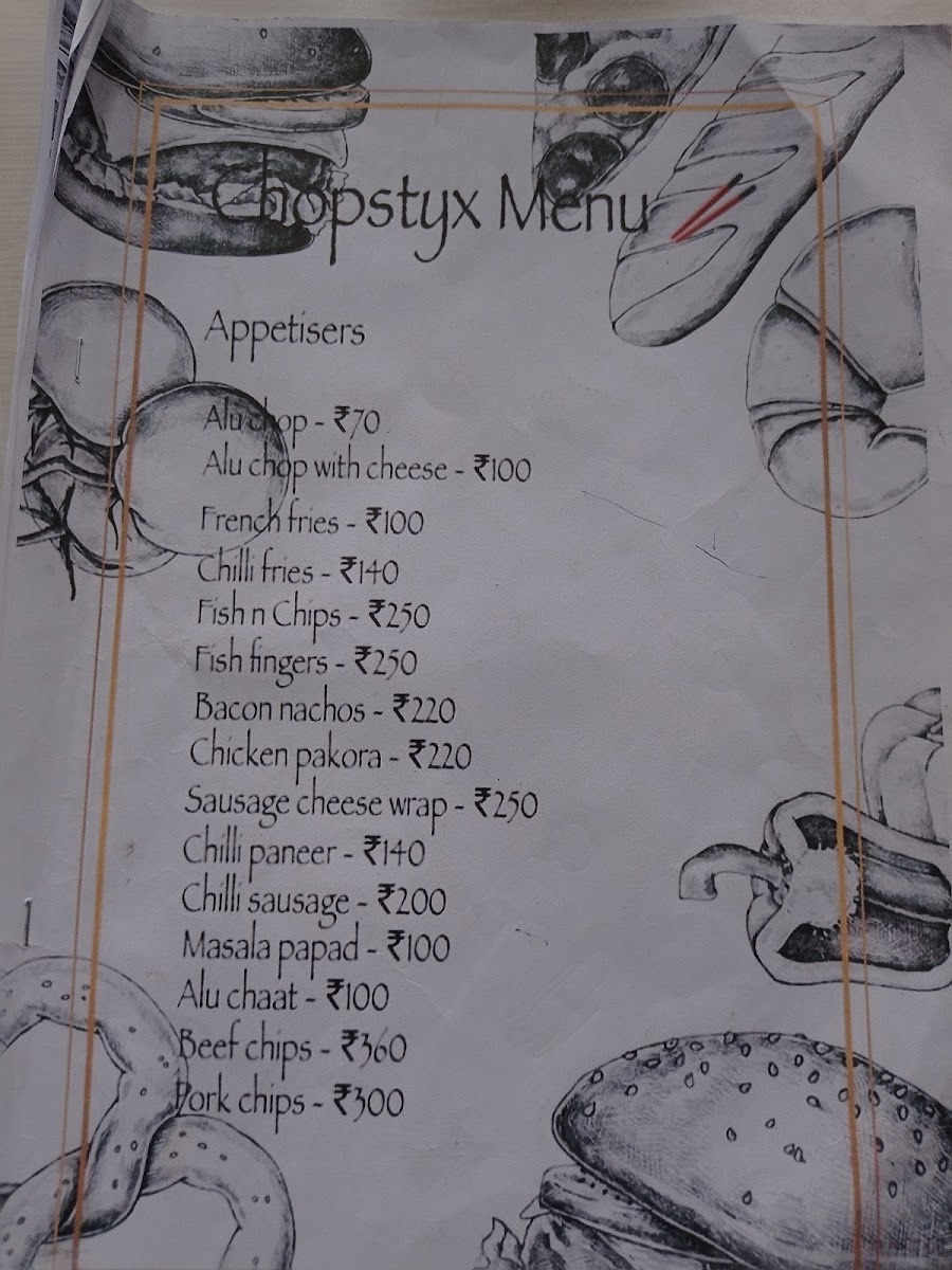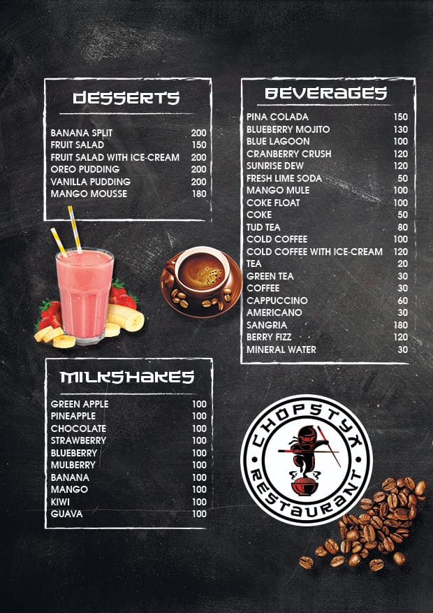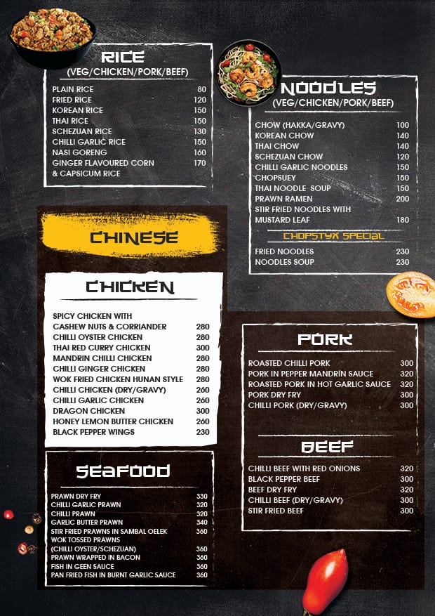 The menu at Chopstyx Restaurant offers a diverse selection of Chinese and seafood dishes, complemented by a variety of beverages and salads. It is organized into distinct categories to cater to different meal preferences and occasions.